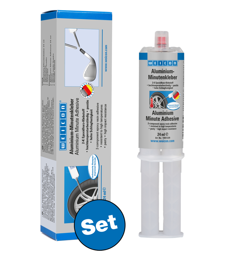 Lepidlo pro vzájemné lepení hliníku a jiných lehkých kovů. WEICON Alu Minutové lepidlo lze použít k vyplňování trhlin a děr, například v hliníkových skříních, a k opravám kol z lehkých slitin. Alu Minutové lepidlo je dvousložkové epoxidové lepidlo s nízkým zápachem a hliníkovou výplní. Je odolný vůči vysokým teplotám až do +180 °C a rychle vytvrzuje při pokojové teplotě. Po vytvrzení lze lepidlo opracovat (pilování, vrtání, frézování). Alu Minutové lepidlo vyplňuje mezery, nekape (je tixotropní) a má velmi vysokou pevnost v tahu a rázu. Aby bylo dosaženo optimální přilnavosti, měly by být lepené plochy suché a zbavené mastnoty nebo nečistot. Oškrábání nebo přebroušení povrchu před čištěním navíc zlepšuje přilnavost.
