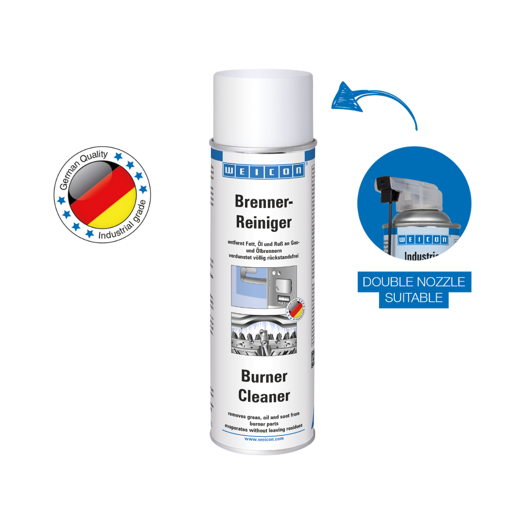 WEICON Čistič hořáků je speciální čistič pro odstraňování tuků, olejů, sazí a dalších nečistot z hořáků. WEICON Čistič hořáků se odpařuje beze zbytku. WEICON Čistič hořáků lze použít na tryskách, čelistech, na rotorech dmychadel a ventilátorů, na zapalovacích elektrodách atd.