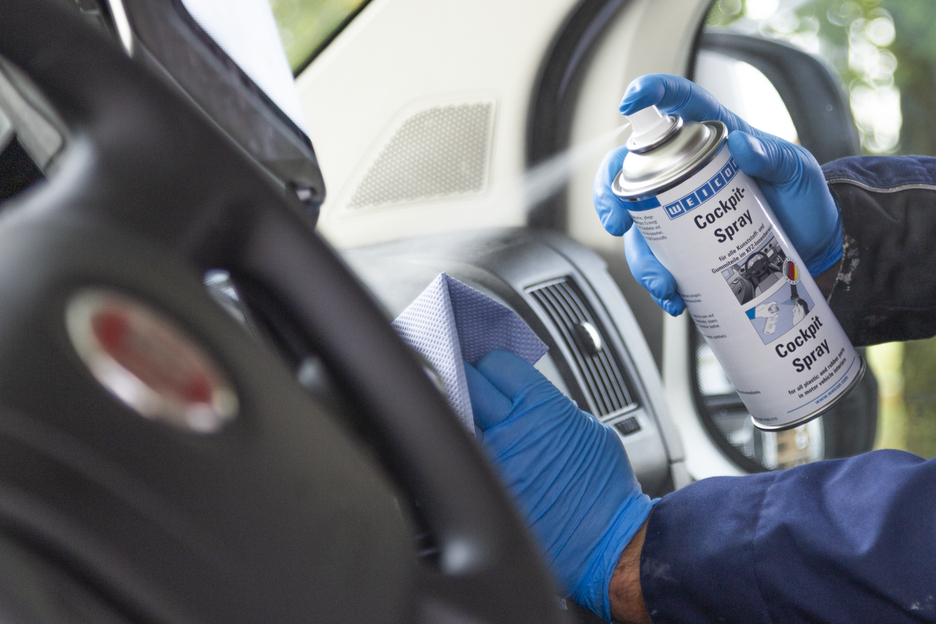 WEICON Cockpit sprej je voděodolný prostředek k ošetřování všech plastových a gumových dílů a je vhodný i na lakované dřevěné povrchy v interiérech motorových vozidel. Trvalý neviditelný ochranný film zabraňuje znečištění a dodává snadno udržovatelný hedvábný lesk, který odpuzuje prach. Cockpit sprej osvěžuje matné a zestárlé plasty, chrání pryž před stárnutím, zůstává pevná a elastická. WEICON Cockpit sprej zabraňuje skřípavým zvukům, ošetřuje přístrojové panely, vnitřní obložení, všechny plastové a pryžové prvky, kůži, dřevo a chrom, střechy automobilů z mělé kůže, zabraňuje přimrzání těsnění dveří, kurfu a oken. Slouží jako mazivo bezpečnostních pásů, vedení sedaček, skládacích střech, okenních skel, zámků a všude tam, kde by tuky mohly způsobit znečištění.