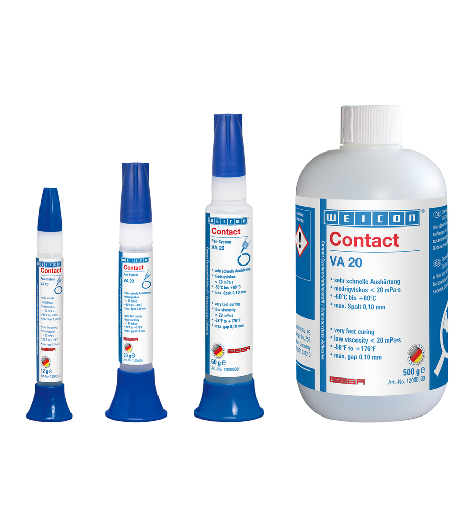 WEICON Contact VA 20 má nízkou viskozitu (< 20 mPa-s) a velmi rychle vytvrzuje. VA 20 je vhodné pro lepení plastů a pryže a také pro přesné spoje kov/plast.