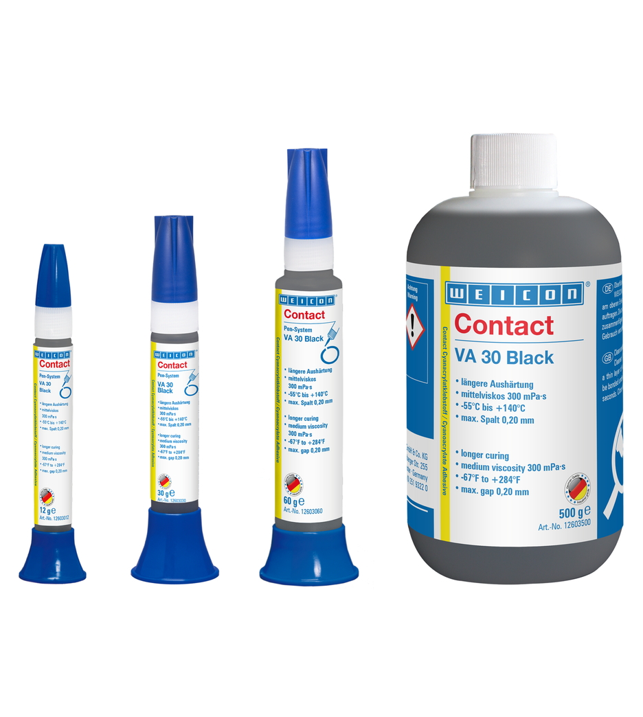 WEICON Contact VA 30 Black je středně viskozní (300 mPa-s) a teplotně odolné od -50°C do +140°C. Má delší čas vytvrzení, je černé s pryžovým plnivem, vytvrzuje se zbytkovou elasticitou a má vysokou odolnost proti loupání a rázovou odolnost. Díky vytvrzení s trvalou zbytkovou pružností je WEICON Contact VA 30 Black vhodný zejména pro proměnlivé klimatické podmínky. Je necitlivé zejména proti dlouhodobému působení vlhkosti. VA 30 Black je ideální pro lepení různých pryžových materiálů jako je plná nebo pěnová pryž, plasty nebo kov a pryž.