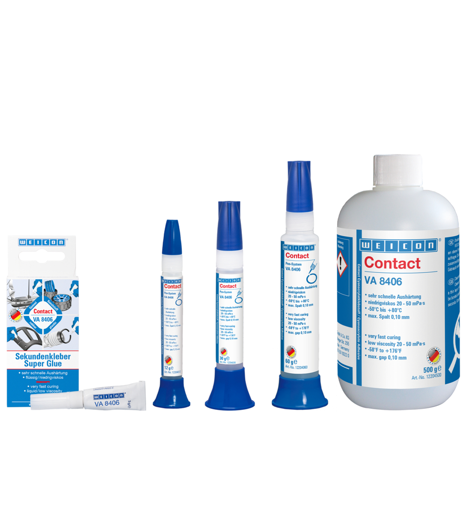 WEICON Contact VA 8406 má nízkou viskozitu (20-50 mPa-s) a velmi rychle vytvrzuje. Je vhodný pro fixaci a lepení různých pryžových materiálů jako je plná nebo pěnová pryž, plasty a elastomery EPDM, u kterých se vyžaduje rychlá fixace. V kombinaci s WEICON CA-Primerem lze VA 8406 použít také pro polyolefiny (PE-polyetylén, PP-polypropylén), PTFE a silikony.