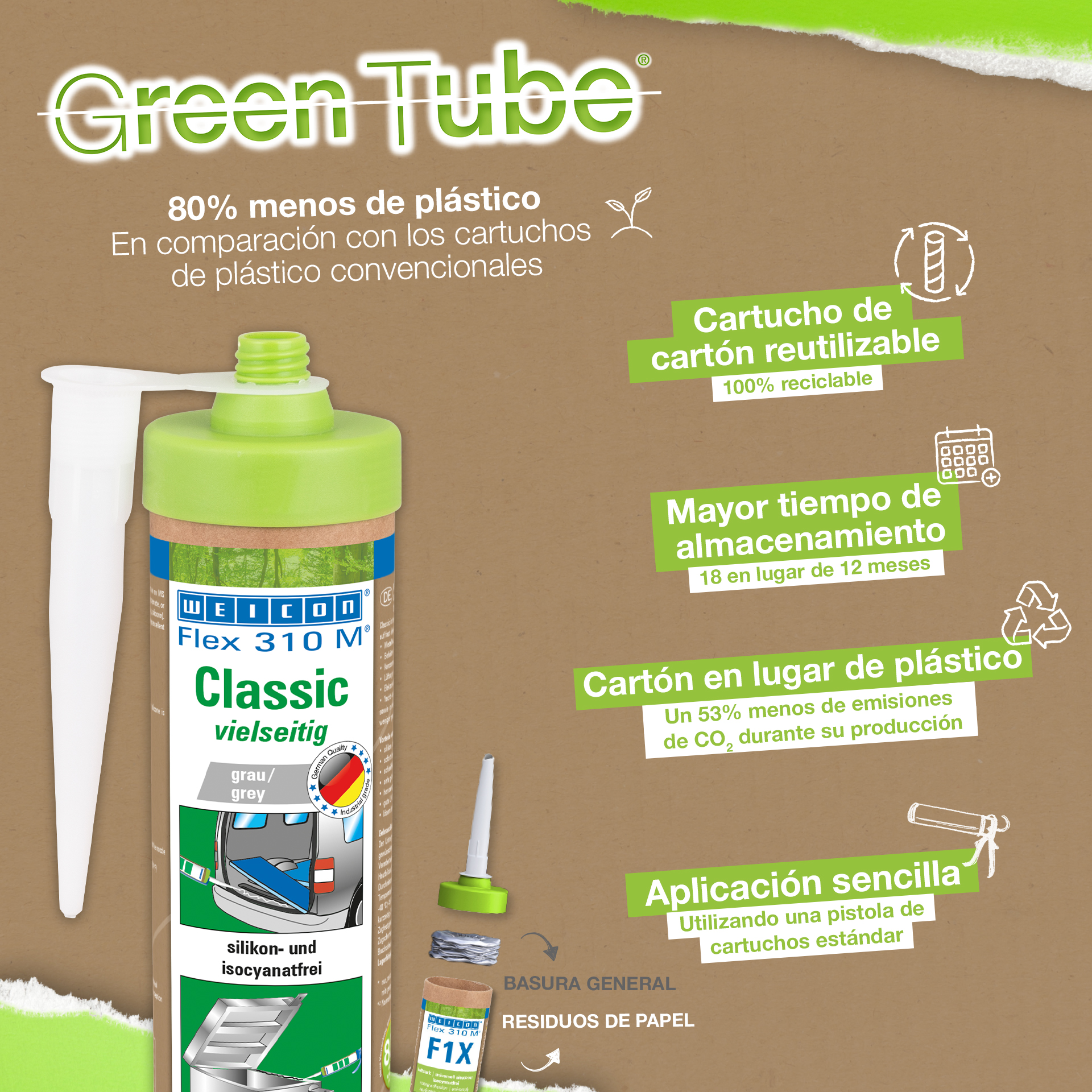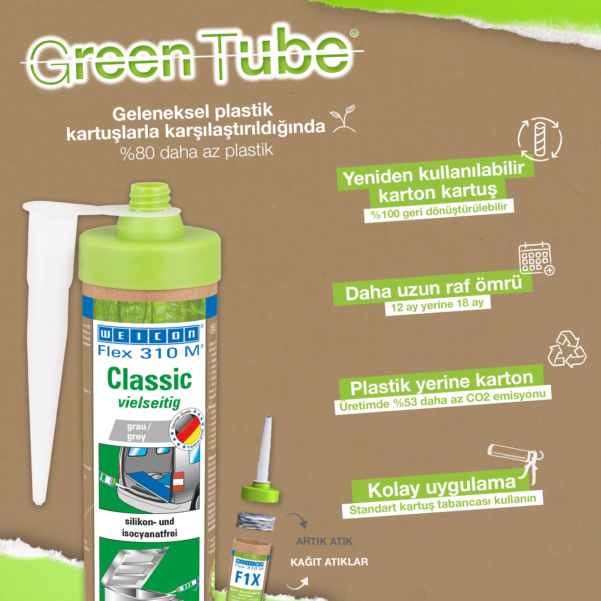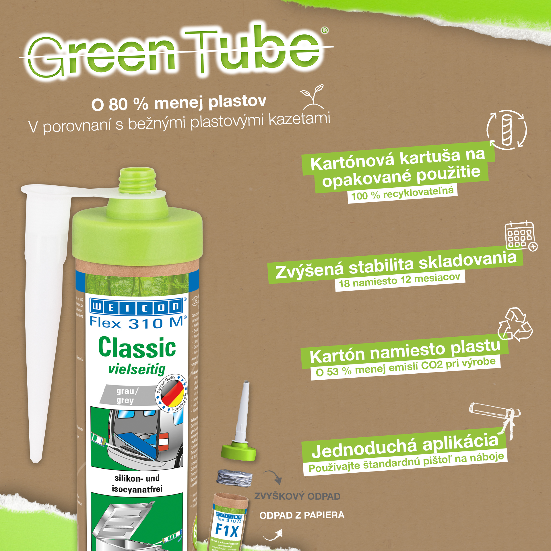 WEICON Flex 310 M Classic má vysokou přilnavost, je přelakovatelný "mokrý na mokrý", lze jej brousit, má vynikající odolnost proti stárnutí a dobrou stabilitu proti UV záření. Odolává sladké i slané vodě, neobsahuje silikon, izokyanát, halogeny a rozpouštědla. Flex 310 M Classic má atest ISEGA a lze jej používat jako lepidlo v potravinářství. Flex 310 M Classic je elastické lepidlo na bázi MS Polymeru.. Je vhodné pro lepení kovů, mnoha plastů, keramiky, dřeva, skla a kamene. WEICON Flex 310 M Classic lze použít při výrobě kovových konstrukcí a nádrží, při výrobě přístrojů, karoserií, vozidel a kontejnerů, v klimatizační a ventilační technice, v elektrotechnickém průmyslu, při stavbě lodí a člunů a všude tam, kde nejsou vhodné produkty silikonové nebo s obsahem silikonu.