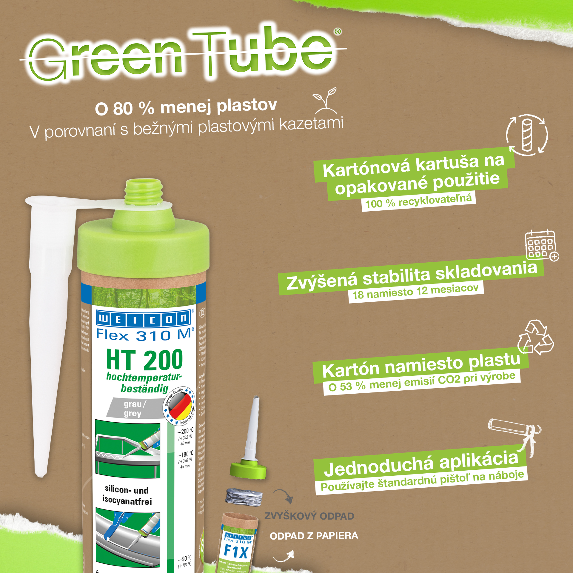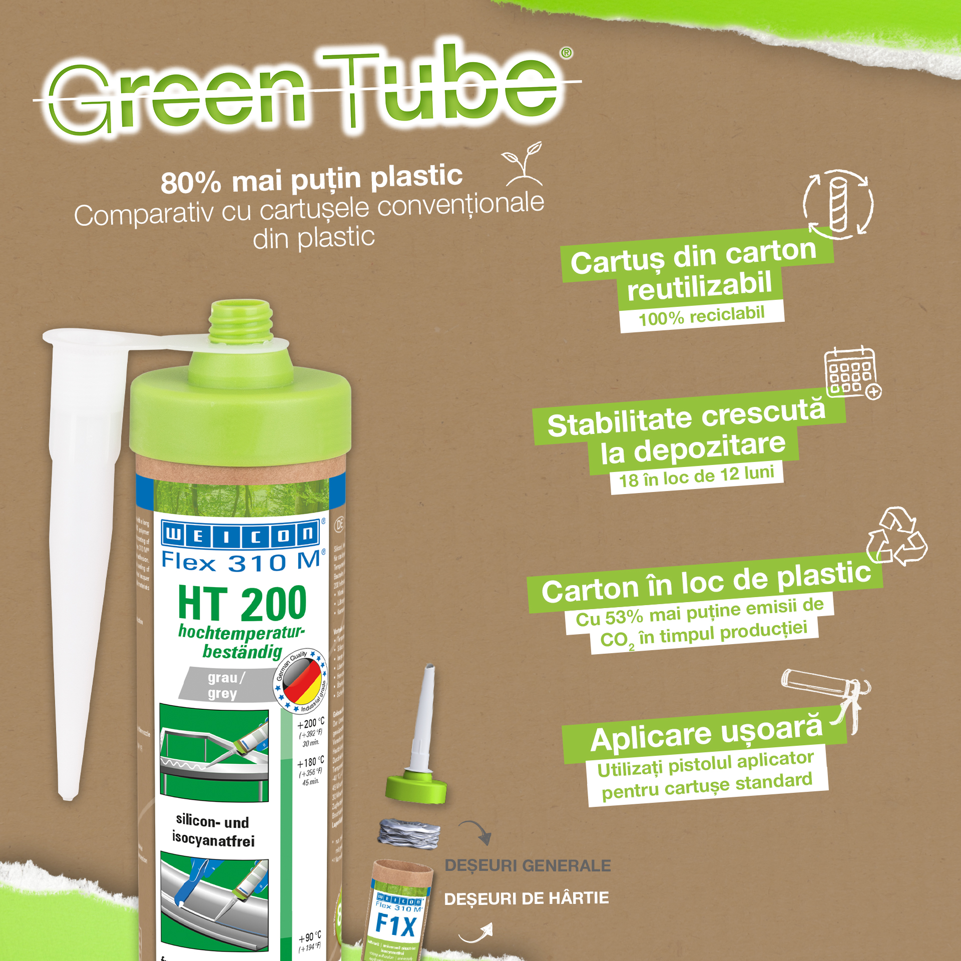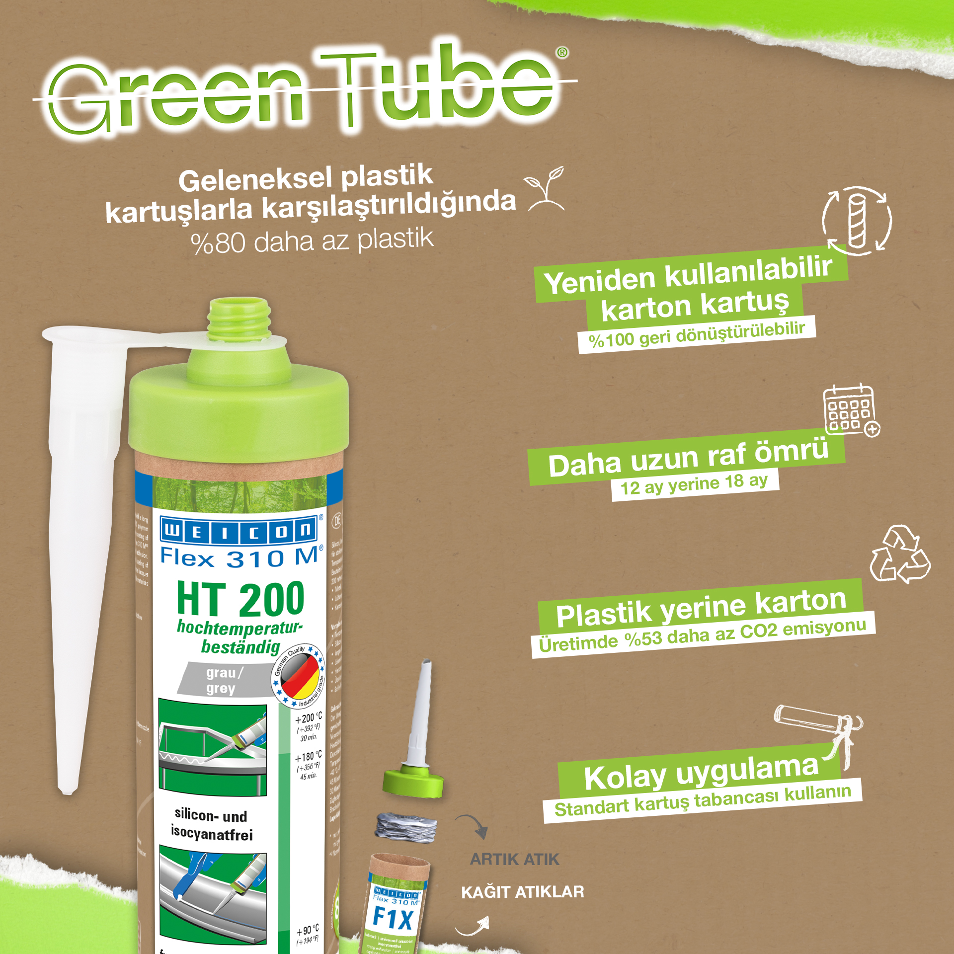 Vysoká teplotní stálost umožňuje lepení a těsnění konstrukčních prvků, na které se následně nanáší vypalovací lak (práškové lakování). WEICON Flex 310 M HT 200 lze použít při výrobě kovových konstrukcí a nádrží, v klimatizační a ventilační technice, při výrobě karoserií, kontejnerů, vagonů a vozidel. WEICON Flex 310 M HT 200 je odolné proti vysokým teplotám, má vynikající odolnost proti stárnutí, je bez silikonů, izokyanátů, halogenů a rozpouštědel.