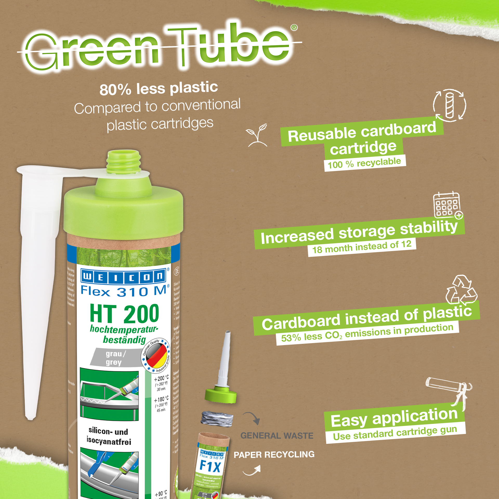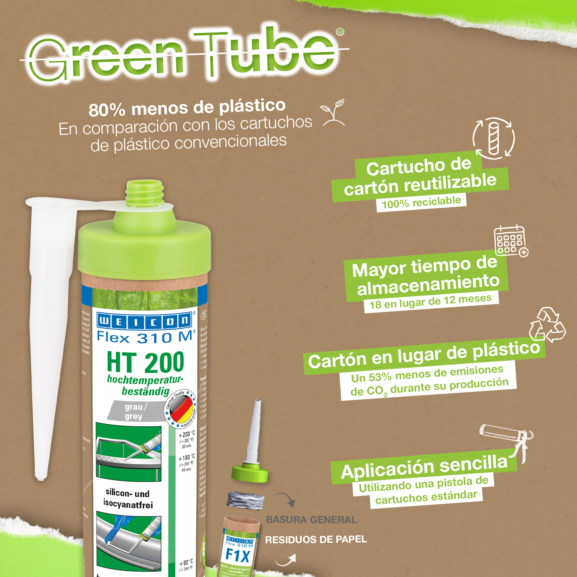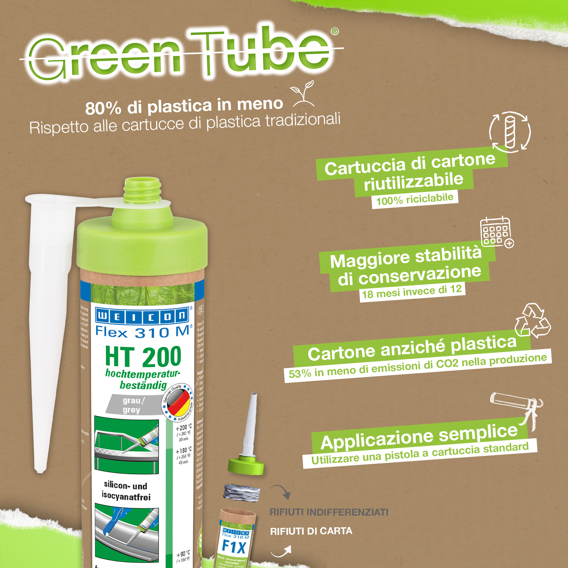 Vysoká teplotní stálost umožňuje lepení a těsnění konstrukčních prvků, na které se následně nanáší vypalovací lak (práškové lakování). WEICON Flex 310 M HT 200 lze použít při výrobě kovových konstrukcí a nádrží, v klimatizační a ventilační technice, při výrobě karoserií, kontejnerů, vagonů a vozidel. WEICON Flex 310 M HT 200 je odolné proti vysokým teplotám, má vynikající odolnost proti stárnutí, je bez silikonů, izokyanátů, halogenů a rozpouštědel.