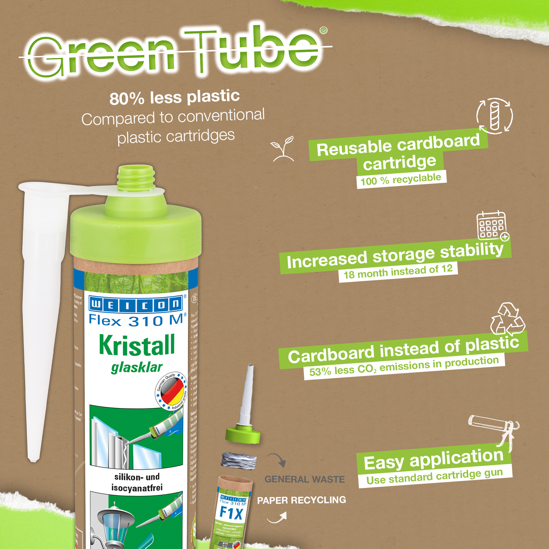 WEICON Flex 310 M Krystal je transparentní, s vysokou přilnavostí, přetíratelný na mokrý podklad. Lze jej brousit, má vynikající odolnost proti stárnutí, dobrou stabilitu vůči UV záření, odolává sladké i slané vodě, neobsahuje silikon, izokyanát, halogeny a rozpouštědla. WEICON Flex 310 M Krystal má certifikát ISEGA a lze jej použít jako lepidlo v potravinářství. WEICON Flex 310 M Krystal je po vytvrzení čiré a a vhodné zejména pro elastické spoje, u kterých nemá nebo nesmí být vidět lepidlo. Flex 310 M Krystal lze použít při výstavbě interiérů a v systémech pro suchou stavbu, při výrobě kovových konstrukcí a nádrží, v klimatizační a ventilační technice, při výstavbě veletrhů a výstav, při stavbě lodí a člunů a všude tam, kde nejsou vhodné produkty silikonové nebo s obsahem silikonu.