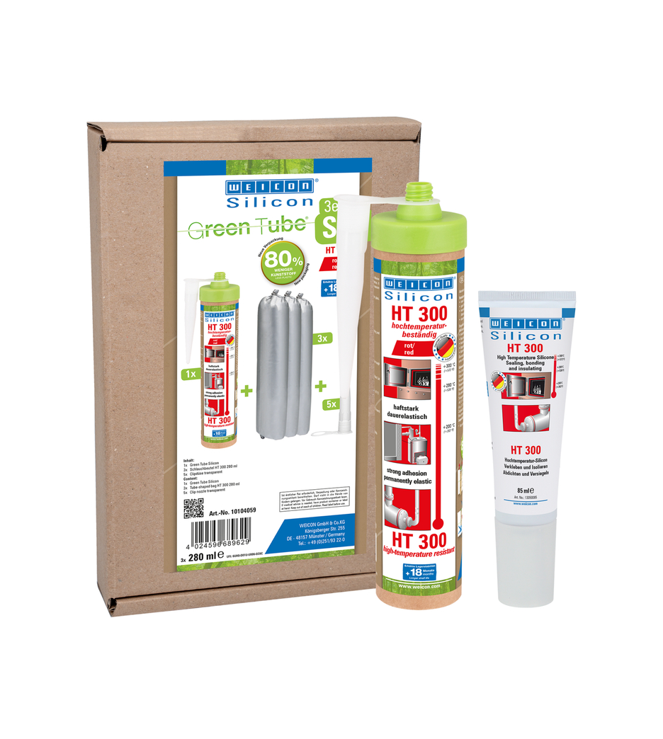 WEICON HT 300 je odolný proti vysokým teplotám (+300 °C/+572 °F), bez rozpouštědla, s vysokou přilnavostí, s polymerujícím acetátem, odolává klimatu, stárnutí a chemikáliím a je extrémně elastický (roztažnost cca 300%). HT 300 je mimořádně vhodné pro tepelně zatížené lepené spoje a těsnění. Přilne velmi dobře k oceli, hliníku, keramice, sklu a mnoha dalším materiálům. WEICON HT 300 lze používat v průmyslových pecích, ve spalinovodech, v topných soustavách, v systémech kouřovodů, v tepelných výměnících a v mnoha dalších oblastech.
