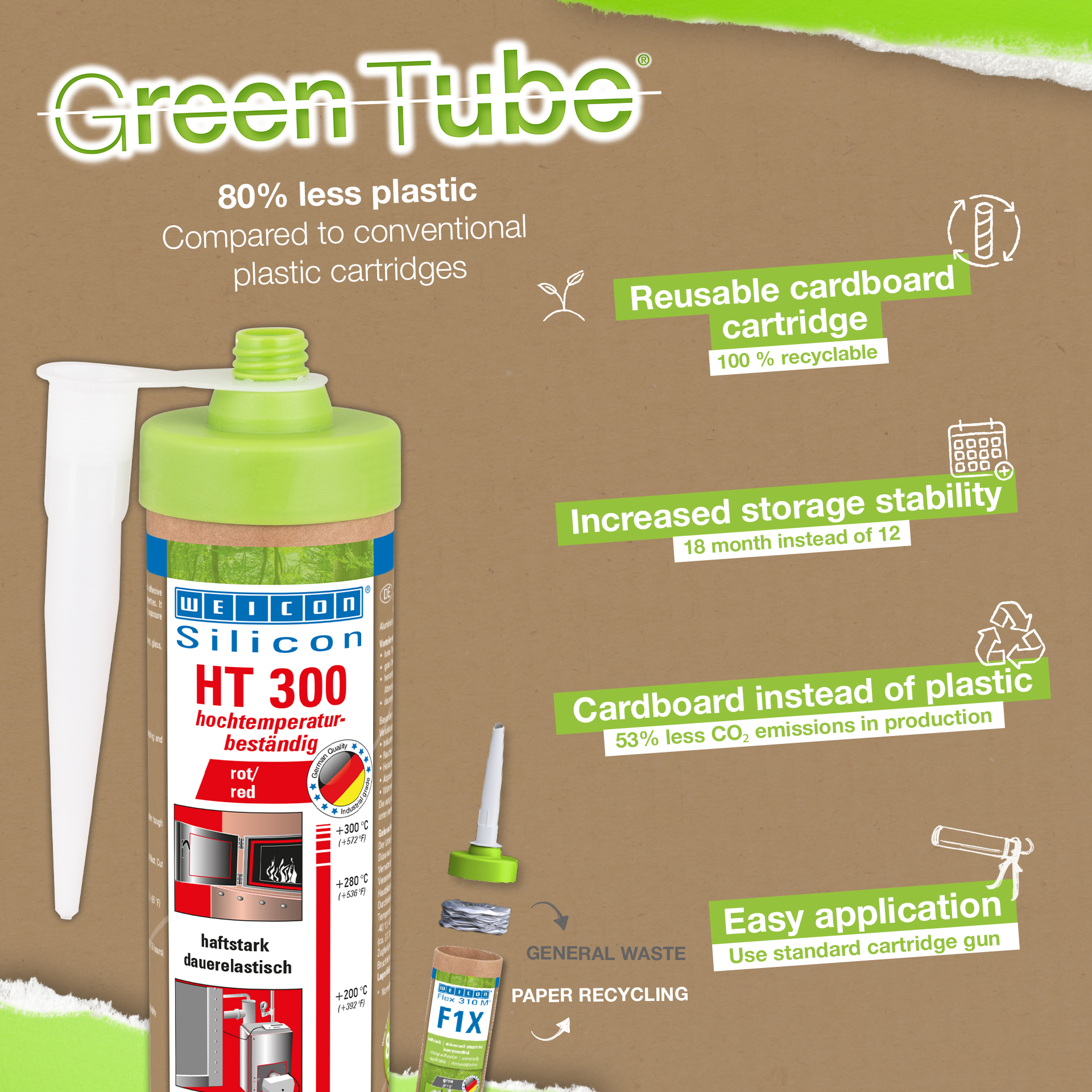 WEICON HT 300 je odolný proti vysokým teplotám (+300 °C/+572 °F), bez rozpouštědla, s vysokou přilnavostí, s polymerujícím acetátem, odolává klimatu, stárnutí a chemikáliím a je extrémně elastický (roztažnost cca 300%). HT 300 je mimořádně vhodné pro tepelně zatížené lepené spoje a těsnění. Přilne velmi dobře k oceli, hliníku, keramice, sklu a mnoha dalším materiálům. WEICON HT 300 lze používat v průmyslových pecích, ve spalinovodech, v topných soustavách, v systémech kouřovodů, v tepelných výměnících a v mnoha dalších oblastech.