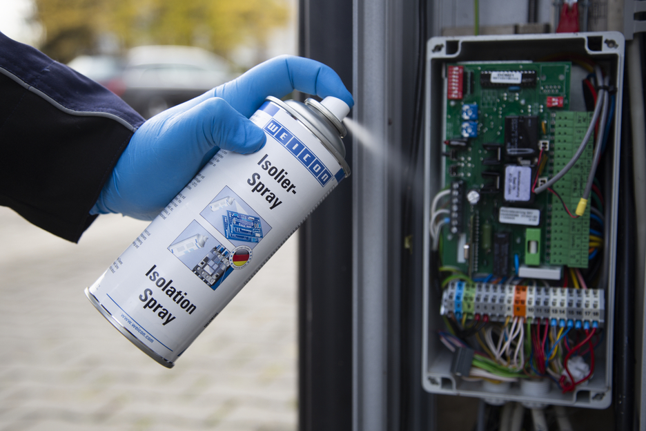 WEICON Izolační sprej je čirý izolační a krycí lak na bázi alkydové pryskyřice. Vytvrzuje do pružného a odolného filmu s vynikající přilnavostí k většině běžných povrchů, jako je kov, sklo, plast, dřevo atd. Izolační sprej je odolný vůči UV záření, kyselinám, olejům a zásadám, je odolný proti vlhkosti a povětrnostním vlivům a vyznačuje se zejména vysokou dielektrickou pevností. Sprej slouží jako ochranný lak na elektrických spojích, vypínačích, rozvaděčích, elektronických součástkách a elektrických cívkách, jako univerzální těsnění v elektrotechnice nebo k opravě izolací na elektromotorech, vinutích a rámech.