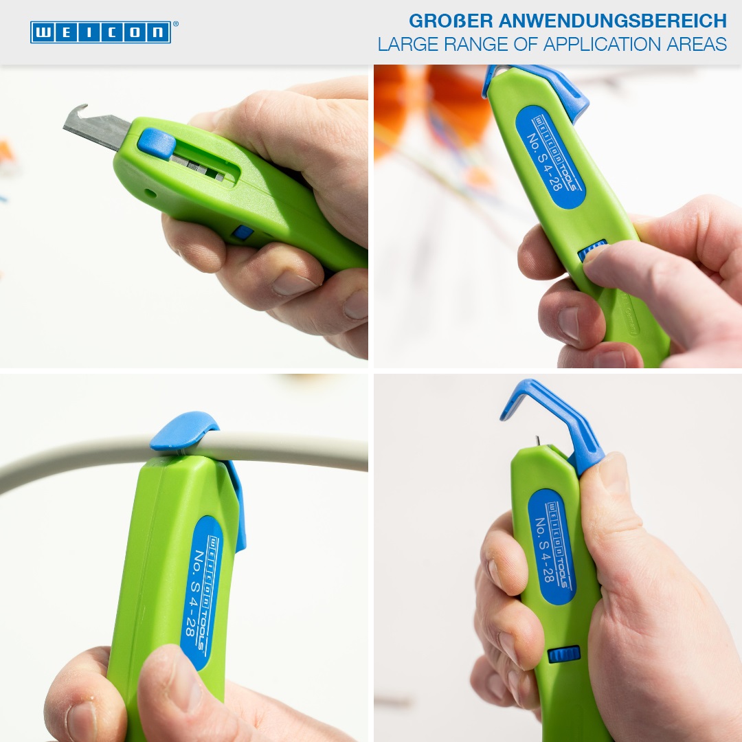 Narzędzie można łatwo dostosować do różnych średnic kabli dzięki niebieskiemu pierścieniowi na uchwycie. Kabeł umieszcza się na końcu narzędzia, przekładając go przez plastikowy zaczep. Po obrocie pierścienia można regulować głębokość cięcia. Na końcu obieraczki znajduje się druga, wyciągana po naciśnięciu niebieskiego suwaka, która umożliwia zarówno cięcia liniowe, jak i okrągłe.