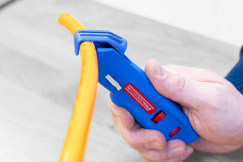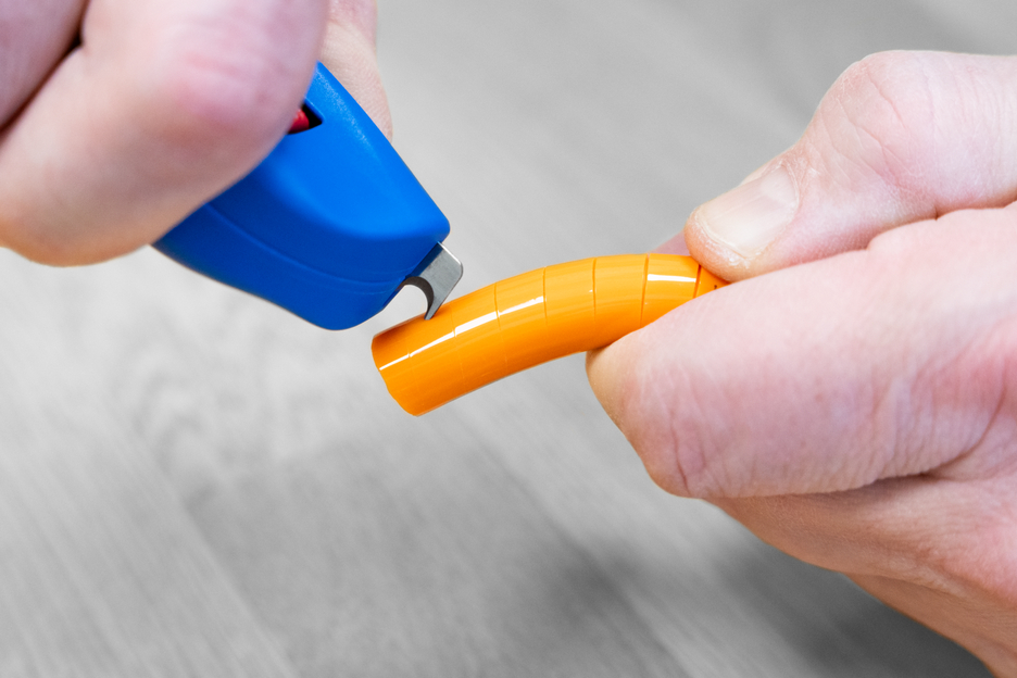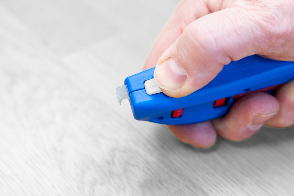 Kabelový nůž No. S 4-28 je ideální pro přesné, rychlé a bezpečné odizolování všech běžných kulatých kabelů o průměru od 4 do 28 mm. Pro kabely, které nelze snadno odizolovat pomocí kruhových a podélných řezů, má nástroj další funkci - spirálový řez, který umožňuje snadné odstranění složité izolace. Otočný vnitřní nůž lze použít pro kruhové, podélné a spirálové řezy na měkké i tvrdé izolaci kabelů. Hloubku řezu lze pohodlně a přesně nastavit v krocích po 0,1 mm v rozmezí 0-3 milimetry pomocí aretovatelného nastavovacího šroubu, který zabraňuje poškození hlubších vrstev. Řezací nůž je samočinně otočný a integrovaný do pouzdra, což umožňuje rychlé automatické přepínání mezi kruhovým a podélným řezem - pouze při použití spirálového řezu je třeba nůž zaaretovat. Pro provedení spirálového řezu se funkce přepíná z kruhového na spirálový řez pomocí nastavovacího kolečka. Poté se přepnutím přepínače spirálového řezu vnitřní nůž zafixuje na místě a odizolovač kabelů je připraven k provedení spirálového řezu. Chcete-li přepnout zpět na kruhový řez, musíte zámek uvolnit pomocí spirálového spínače. Poté se nůž bude opět volně pohybovat a vy budete moci provést kruhový řez běžným způsobem. Po provedení spirálového řezu je vhodné udělat malý řez na konci izolace. Snadněji ji pak odloupnete. K tomuto účelu je nástroj vybaven výsuvným hákovým nožem. Samovtahovací bezpečnostní čepel se ovládá pomocí posuvníku a v případě nesprávného použití se automaticky zasune, aby se zabránilo poranění při řezání. Díky tomu je používání čepele mnohem bezpečnější ve srovnání s pevnými čepelemi, jako jsou například čepele u řezacích nožů.