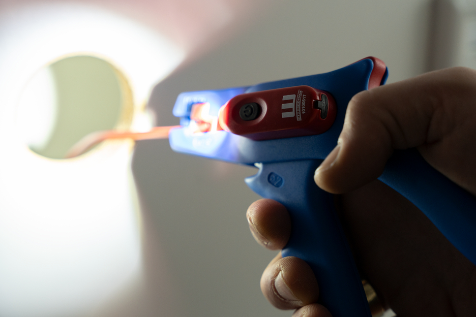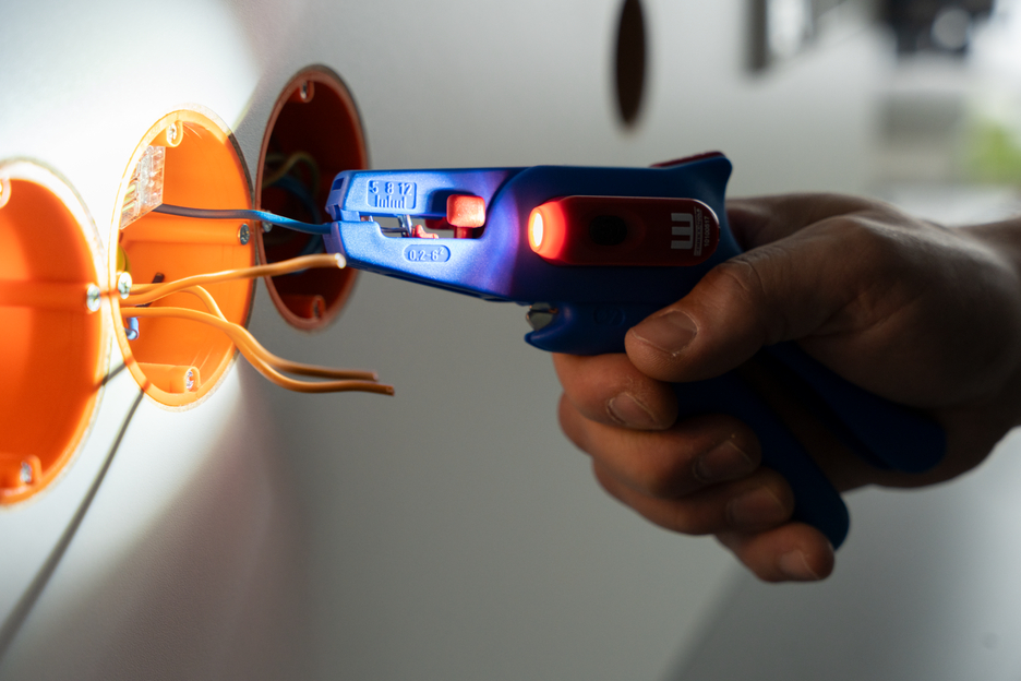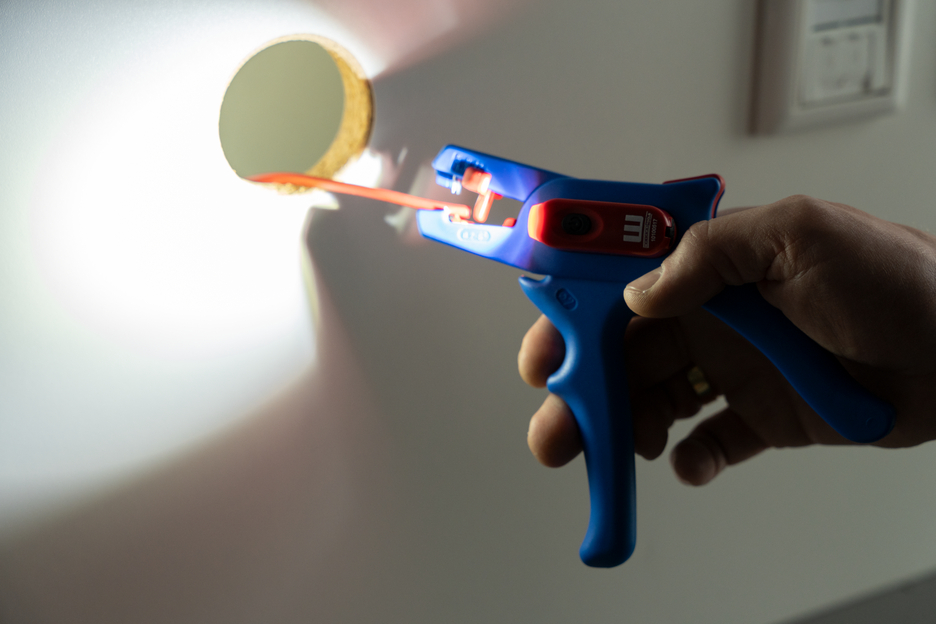 Electricians should always work with the power turned off when handling electrical installations, wires or devices. During work, e.g. in a construction site, there is often insufficient lighting or illumination. This new work light offers a perfect solution. The work light is very easy to attach to the stripping tool. To attach it, simply remove the printed plastic plate on one side of the stripper and press the light with its two mounting points into the designated holes. This ensures that the work light always remains in the correct position and cannot fall or slip. The lamp is switched on by pressing the switch. Press several times to select the brightness level (three levels with 50, 127 or 250 lumens). To switch off the lamp, press and hold the on/off switch. The LED Work Light has a length of 48 mm and a weight of 15 g. The LED light has IP65 certification and is both dustproof and splash-resistant. The Work Light has a 180 mAh lithium battery and can be used for approx. 2 hours on a medium setting after a charging time of 40 minutes. The service life of the battery charge varies depending on the selected light intensity. The WEICON TOOLS LED Work Light is available in the colours red and black.