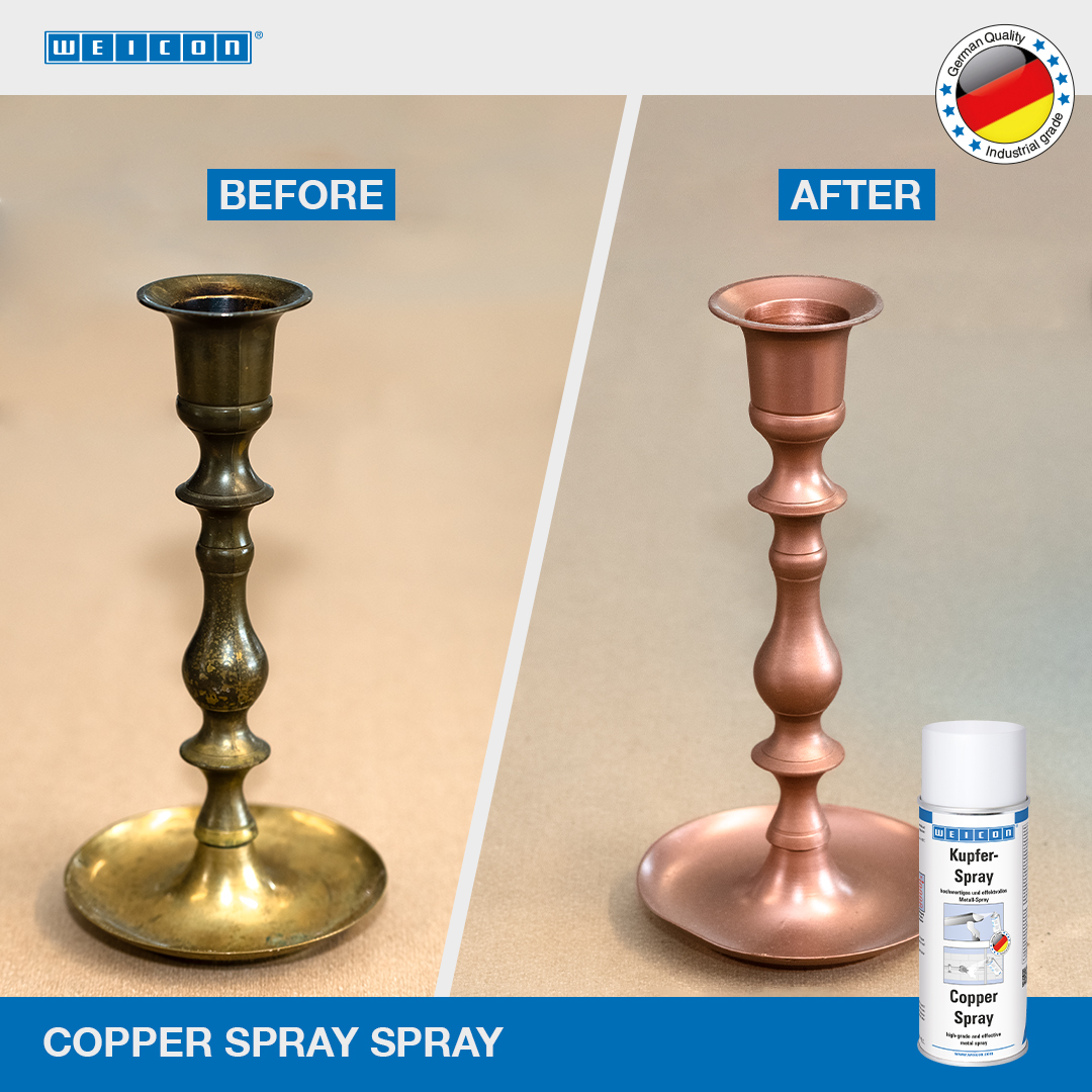 WEICON Měděný sprej je vysoce kvalitní kovový sprej s dobrou přilnavostí, s vysokým podílem mědi, pro ochranné a dekorativní povlaky, s efetním charakterem barevného kovu, pro venkovní i vnitřní použítí. Slouží také k optickému zvýraznění (pomědění) povrchů různých materiálů, dílů. Měděný sprej lze použít na okenní plechy, okapy a svody, vnějí osvětlení, poštovní schránky, na dekorace a pro uměleckou tvorbu.