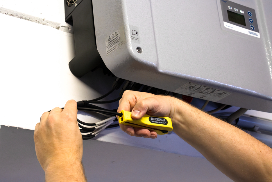 S odizolovačem Mini-Solar 4/6 mm² lze snadno a rychle odizolovat všechny běžné solární kabely. Ruční nastavení hloubky řezu není nutné. Integrovaný délkový doraz (od 6 do 28 mm) je vhodný pro odizolování solárních kabelů o průřezu 4,0 nebo 6,0 mm². Nástroj vyztužený skelnými vlákny má navíc snadno přístupnou boční čepel pro kabely do 10 mm². Při použití odizolovače se během odizolování vytvoří přesný řezný vzor. Kromě toho lze Mini-Solar 4/6 mm² aretovat pro úsporu místa při skladování.