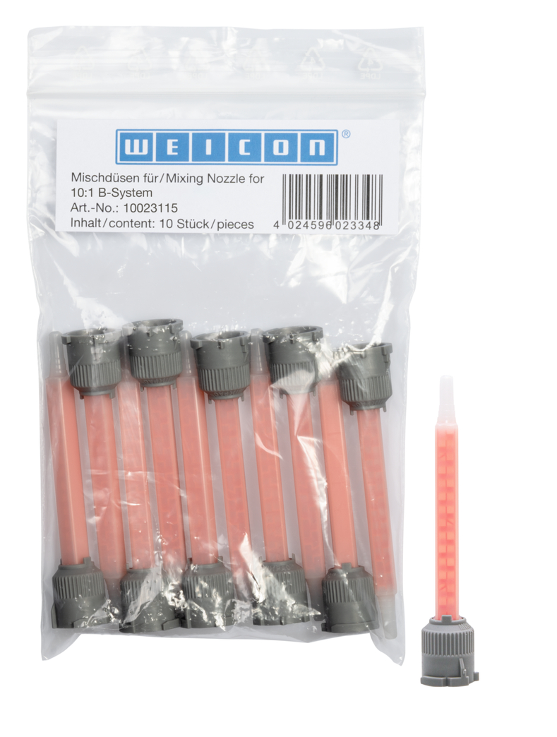 Mísící špička 10:1 B byla speciálně vyvinuta pro dvousložkové lepicí systémy. Použití mísící špičky podporuje zajištění kvality v procesech lepení a zajišťuje reprodukovatelnost výsledků. To je důležité zejména pro průmyslovou sériovou výrobu. Mísící špička umožňuje vysoce kvalitní a profesionální výrobu spojů a vede ke zlepšení procesů lepení. Díky geometrii mísící špičky, která je přesně přizpůsobena mísícímu poměru, se vždy smíchá správné množství pryskyřice a tvrdidla. Použití mísící špičky zajišťuje bezpečné a čisté pracovní procesy a zvyšuje efektivitu díky výraznému snížení nákladů na chyby.