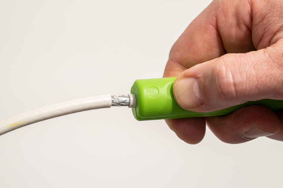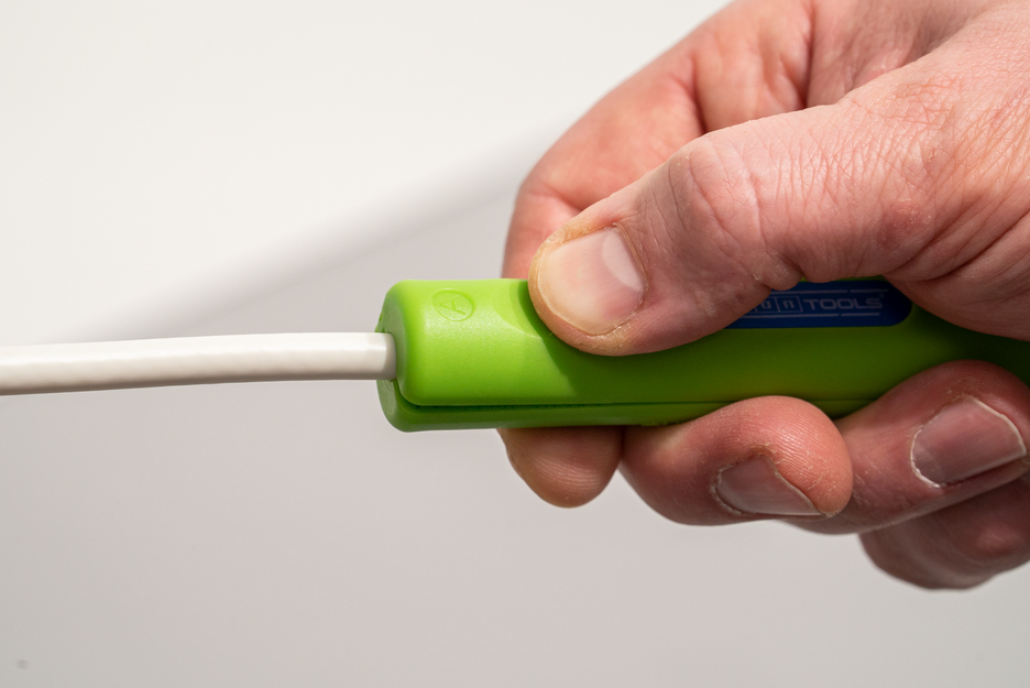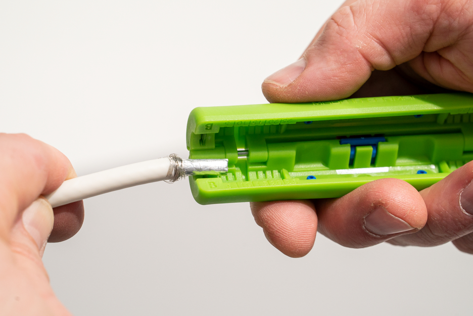 Pracovní rozsah 4,8 - 7,5 mm Ø Nastavení hloubky řezu není potřeba Vhodné i pro flexibilní kabely Stupnice délky (0 - 17 mm) integrovaná v pouzdře Dvouúrovňové odizolování všech běžných koaxiálních kabelů