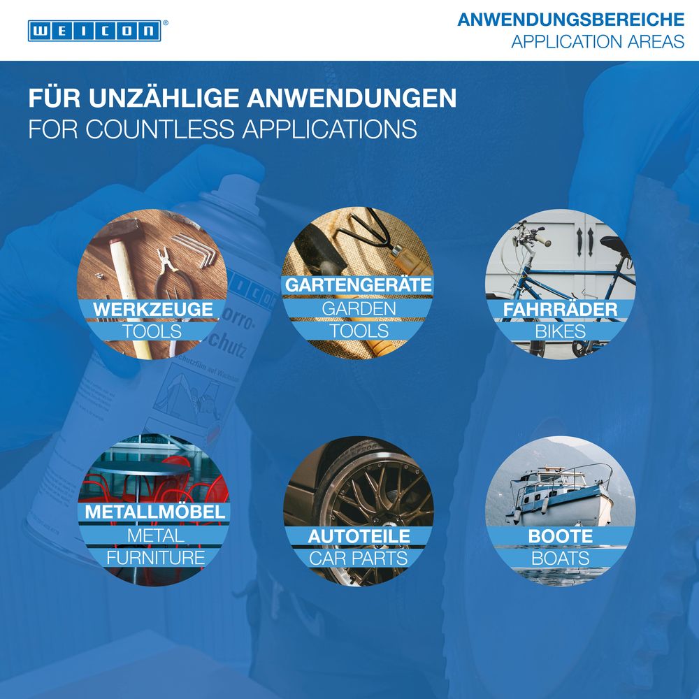 WEICON Ochrana proti korozi je přípravek pro prevenci koroze na bázi vosku. Díky svým vynikajícím plazivým vlastnostem proniká i do nejmenších mezer a vytváří rovnoměrný, nelepivý ochranný film. Pro snadnou vizuální kontrolu je výrobek k dispozici také v barevné verzi magenta, díky níž jsou ošetřené povrchy dobře viditelné. Rychleschnoucí a pružný film spolehlivě vytěsňuje vlhkost a chrání různé povrchy, jako je ocel, hliník nebo zinek, aniž by napadal plasty nebo pryž. Díky tomu je ideální pro konzervaci strojních zařízení a precizních dílů - ať už pro dlouhodobé skladování v interiéru, střednědobé skladování ve venkovním prostředí, ochranu během zahraniční přepravy nebo pro následnou konzervaci součástí vozidel. Účinně chrání vaše součásti před korozí a vlivy prostředí - během skladování, přepravy i běžného provozu.