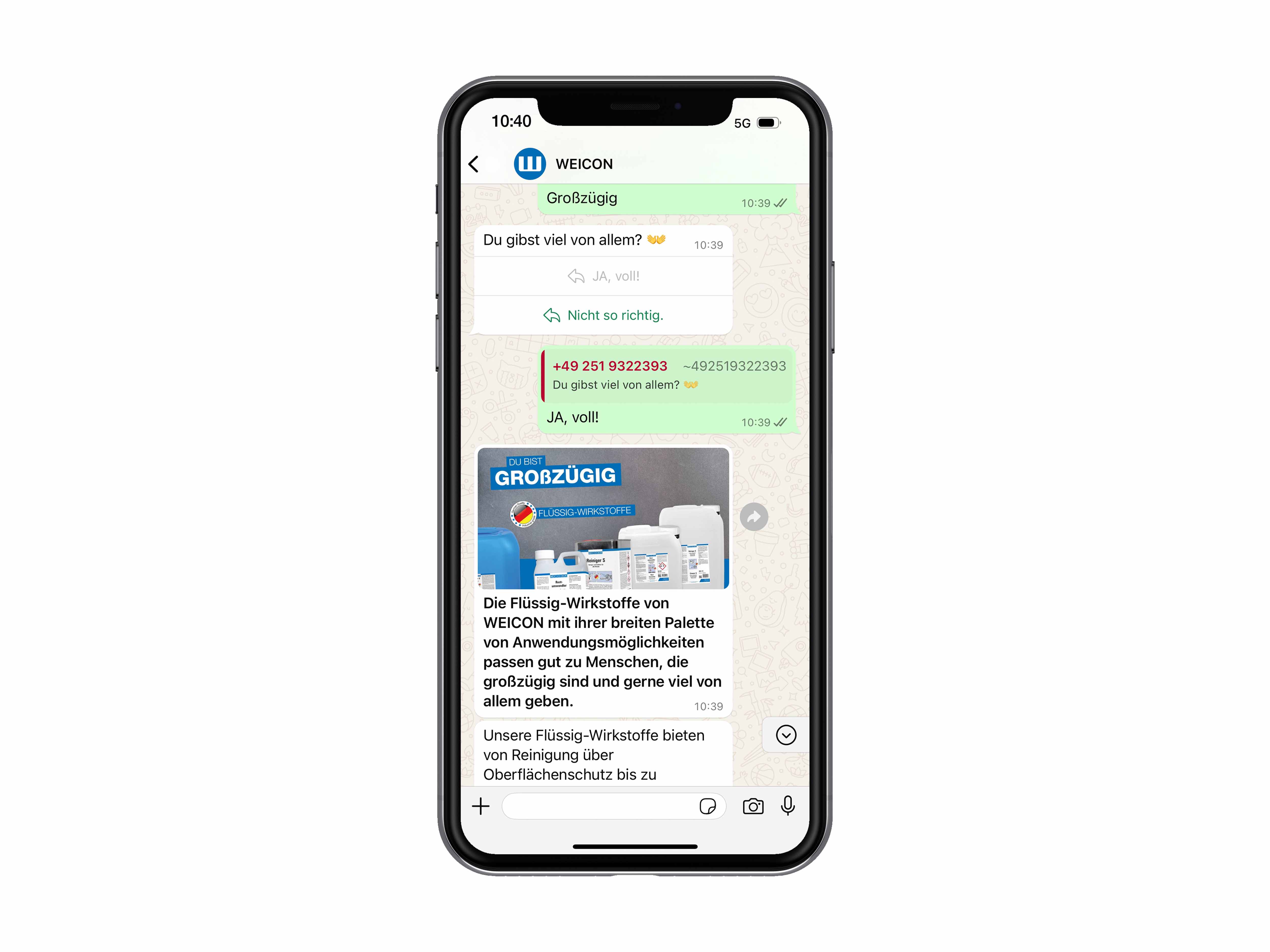 Máte zájem o naše produkty všeobecně? Ale nevíte například, zda byste raději použili mazací olej nebo mazací tuk, lepidlo 1K nebo 2K, nebo vám stále chybí to správné nářadí? Pak využijte náš WhatsApp servis a získejte další informace nebo si na WhatsAppu vyzkoušejte náš test "Který WEICON typ jsem já?".
