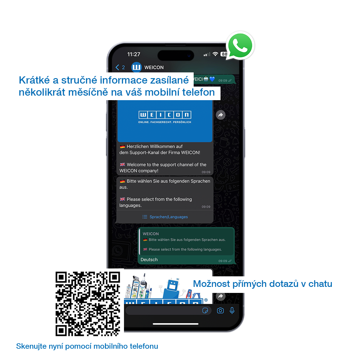 Chcete nás kdykoli a kdekoli kontaktovat, poslat nám fotografie své aplikace nebo použít vyhledávač WEICON TOOLS? Máte dotazy k našim produktům, hledáte správnou kontaktní osobu nebo chcete rychle a snadno objednat přes WhatsApp? To vše jsme vám umožnili! Využijte náš WhatsApp nebo se přihlaste k odběru newsletteru WhatsApp či našeho nového kanálu WhatsApp.