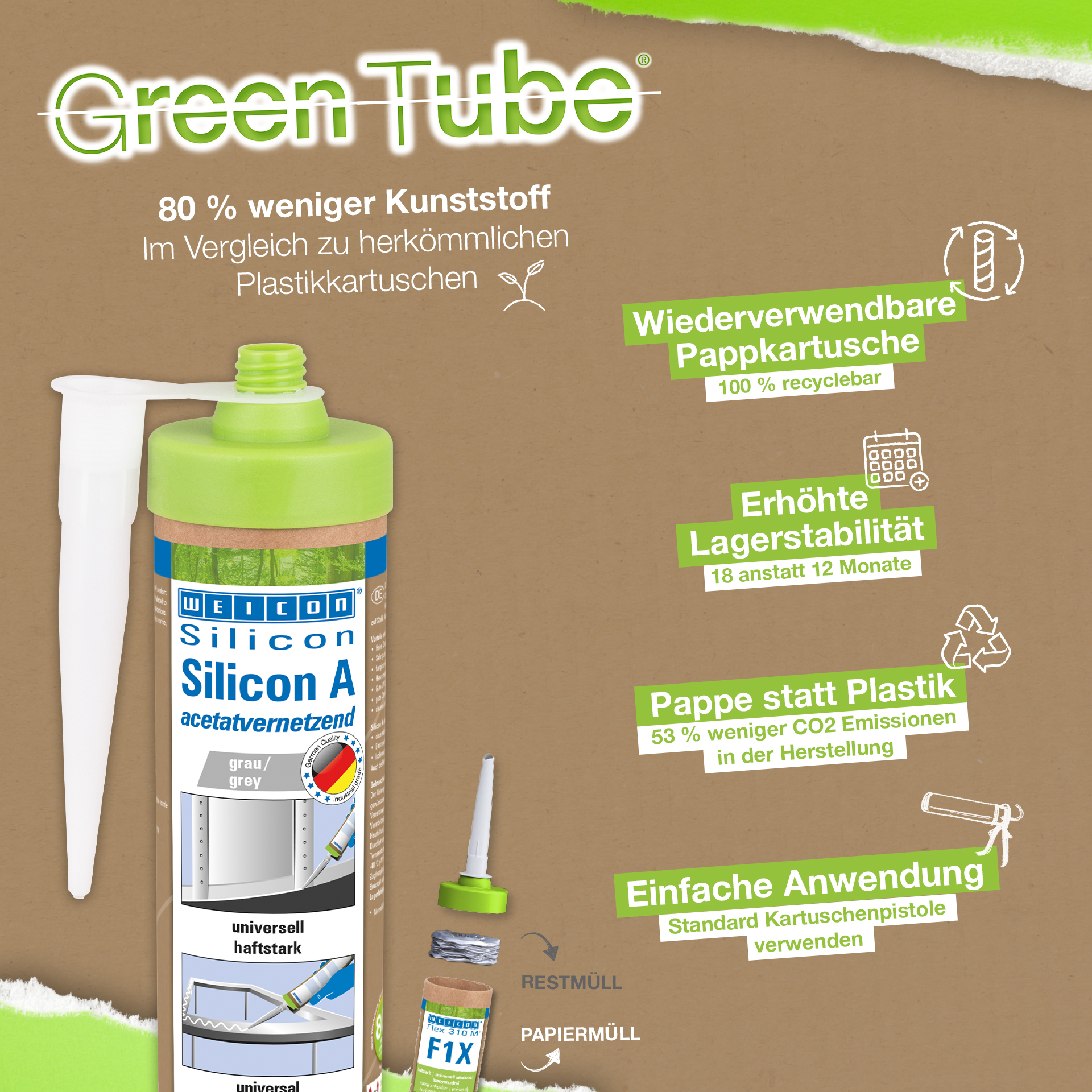WEICON Silikon A je bez rozpouštědla, acetátová síť, s vysokou přilnavostí, trvale elastické, odolávající stárnutí, chemikáliím a teplotám až do+180 °C (+356 °F), extrémně elastické (roztažnost > 700%) a univerzálně použitelné. Silikon A přilne velmi dobře k oceli, hliníku, sklu, keramice a mnoha dalším materiálům. WEICON Silikon A lze použít při stavbě strojů a zařízení, v klimatizační a ventilační technice, v energetice a elektrotechnice, při výstavbě veletrhů, výstav a v mnoha dalších oblastech průmyslu.