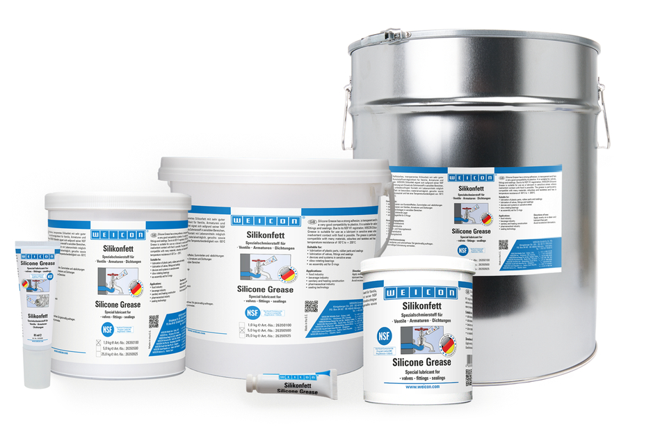 Silikonové mazivo WEICON je vysoce přilnavé, transparentní a velmi dobře kompatibilní s plasty. Díky registraci NSF H1 je vhodný jako mazivo pro ventily, armatury a těsnění v citlivých oblastech. Vyhovuje Směrnici pro hygienické hodnocení organických materiálů ve styku s pitnou vodou (KTW Směrnice) Federální agentury pro životní prostředí. Uplatnění najde v potravinářském a nápojovém průmyslu, v sanitární a topenářské výstavbě, ve farmaceutickém průmyslu i v těsnicí technice. Silikonové mazivo WEICON je testováno na bezpečnost Německým spolkovým ústavem pro výzkum a testování materiálů (BAM) - viz leták 034-1 „Seznam nekovových materiálů pro použití v kyslíku“ (informace DGUV 213-075) BG RCI. Mazivo je zvláště šetrné k materiálu, neutrální vůní a chuti a má teplotní odolnost od -50 °C do +200 °C. WEICON Silikonový tuk HV je vhodný pro mazání plastů, pryžových dílů a těsnění, ventilů, fitinek a těsnění, strojů, zařízení, pomaloběžných ložisek a jako montážní pomůcka pro O-kroužky.