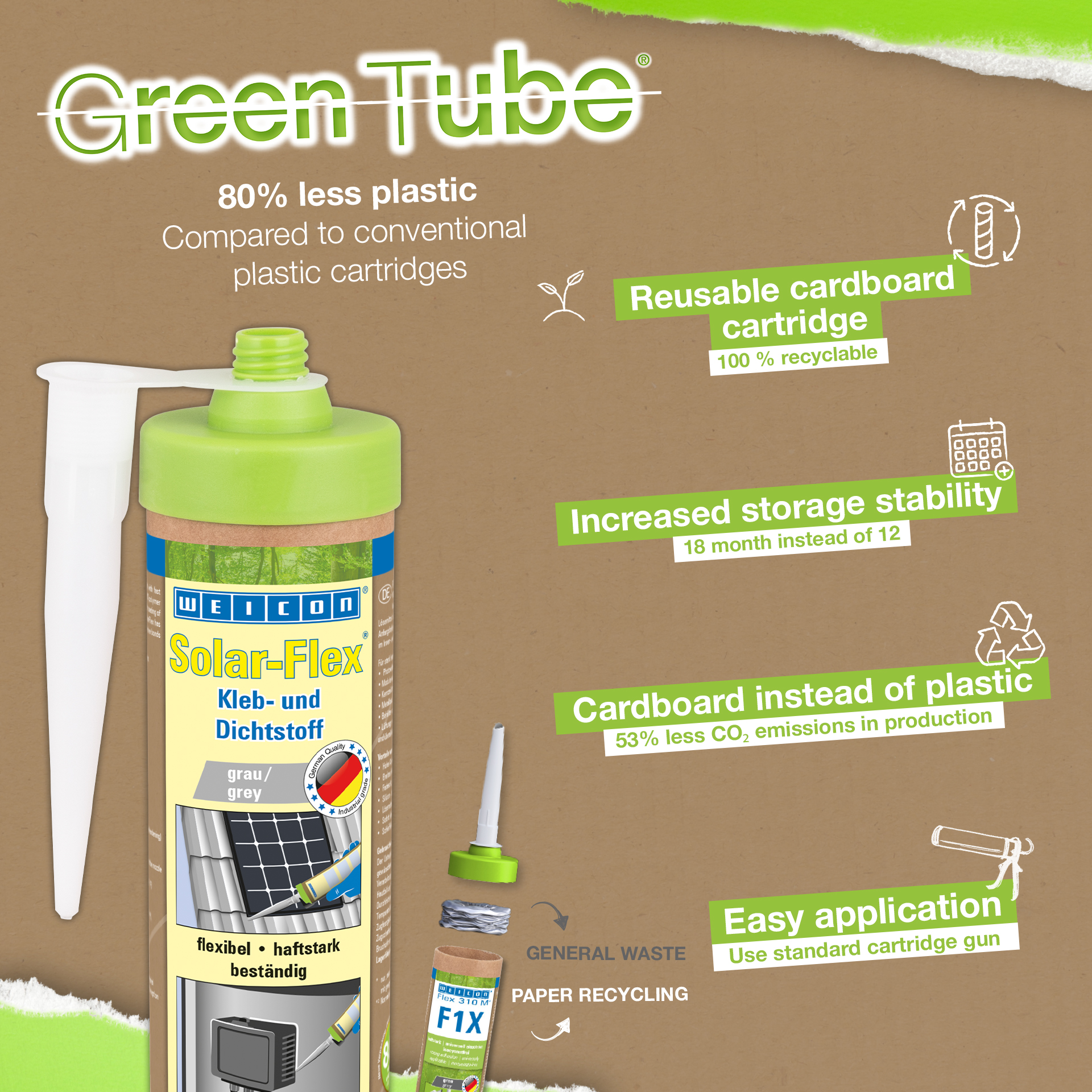 WEICON Solar-Flex má vysokou přilnavost, je nekorozivní, přetíratelný na „mokrý“ podklad, odolný proti klimatu, je bez silikonů, izokyanátů, halogenů a rozpouštědel. Solar-Flex je elastické lepidlo na bázi MS-polymerů, speciálně pro solární techniku. Díky velmi vysoké počáteční přilnavosti a rychlému nárůstu lepicí schopnosti je možné lepení i na svislých plochách. Nahrazuje běžné upevňovací metody montáže solárních a fotovoltaických systémů.