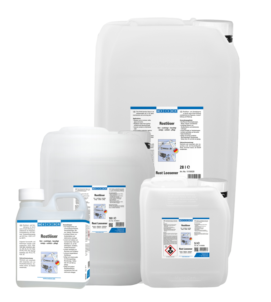 WEICON Uvolňovač rzi je díky svému 6-násobnému účinku nezbytný pro opravy a údržbu. Díky velmi dobré zatékavosti proniká Uvolňovač rzi i do nejmenších spár. WEICON Uvolňovač rzi uvolňuje zkorodované a obtížně pohyblivé konstrukční prvky, šroubení, čepy, klouby a panty, chrání před korozí a oxidací. WEICON Uvolňovač rzi dlouhodobě maže kluzné plochy, čistí a ošetřuje kovové povrchy, mechanické díly a elektrická zařízení a je teplotně odolný od -20°C do +150°C (-4 až +302°F).