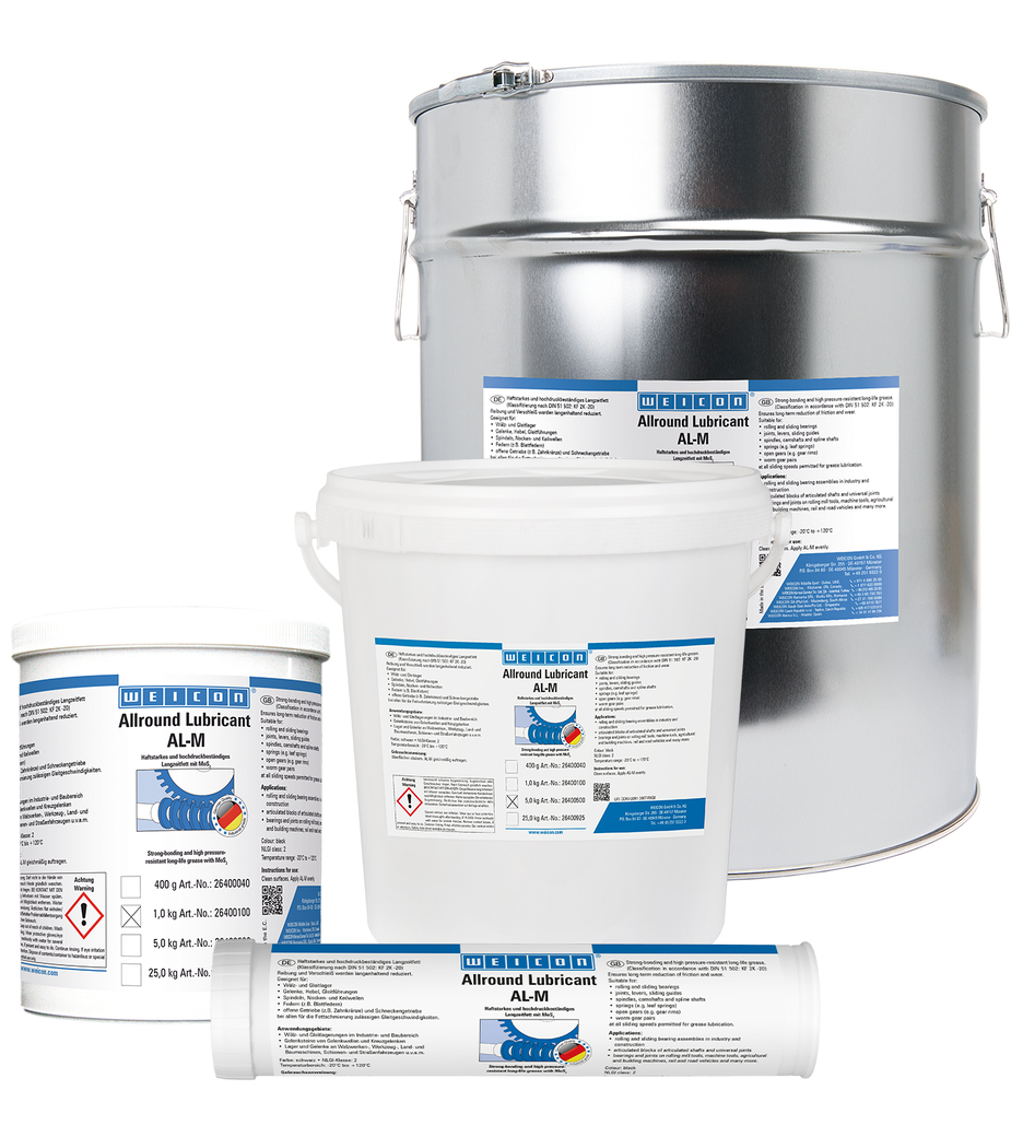 WEICON AL-M trvale snižuje tření a opotřebení a je vhodné pro válečková a kluzná ložiska, klouby, páky, kluzná vedení, vřetena, vačkové hřídele, drážkované hřídele, pružiny, otevřené převody a šnekové převody - při všech kluzných rychlostech povolených pro mazání mazacími tuky