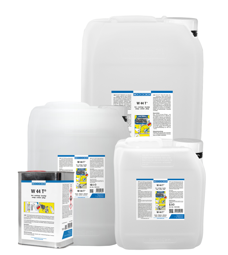 WEICON W 44 T® je multifunkční produkt, který v jediném produktu díky speciálnímu složení účinných látek a vynikající zatékavosti slučuje protikorozní ochranu, vodoodpudivost, mazání, konzervaci a čištění. W 44 T® uvolňuje zadřené šroubení, čepy, armatury a ventily, z elektrických kontaktů vytěsňuje vlhkost, zabraňuje vzniku bludných proudů a usnadňuje spouštěných motorů ve vlhku. W 44 T lze také použít jako řezný olej pro vrtání a řezání. Odstraňuje vrzavé a skřípavé zvuky pantů, ložisek, vedení, kloubů a spojek, čistí znečištěné kovové povrchy. W 44 T® zanechává dlouhodobě ulpívající tenký povlak, který nemaže, nelepí ani nepřitahuje prach, ale ošetřuje chrání nástroje, stroje, elektrické a mechanické přístroje a udržuje jejich funkci. WEICON W 44 T® lze použít téměř kdekoli bez omezení. Vhodný pro dílny, automobilový průmysl, námořní, elektro, zemědělství, domácnost a hobby použití.