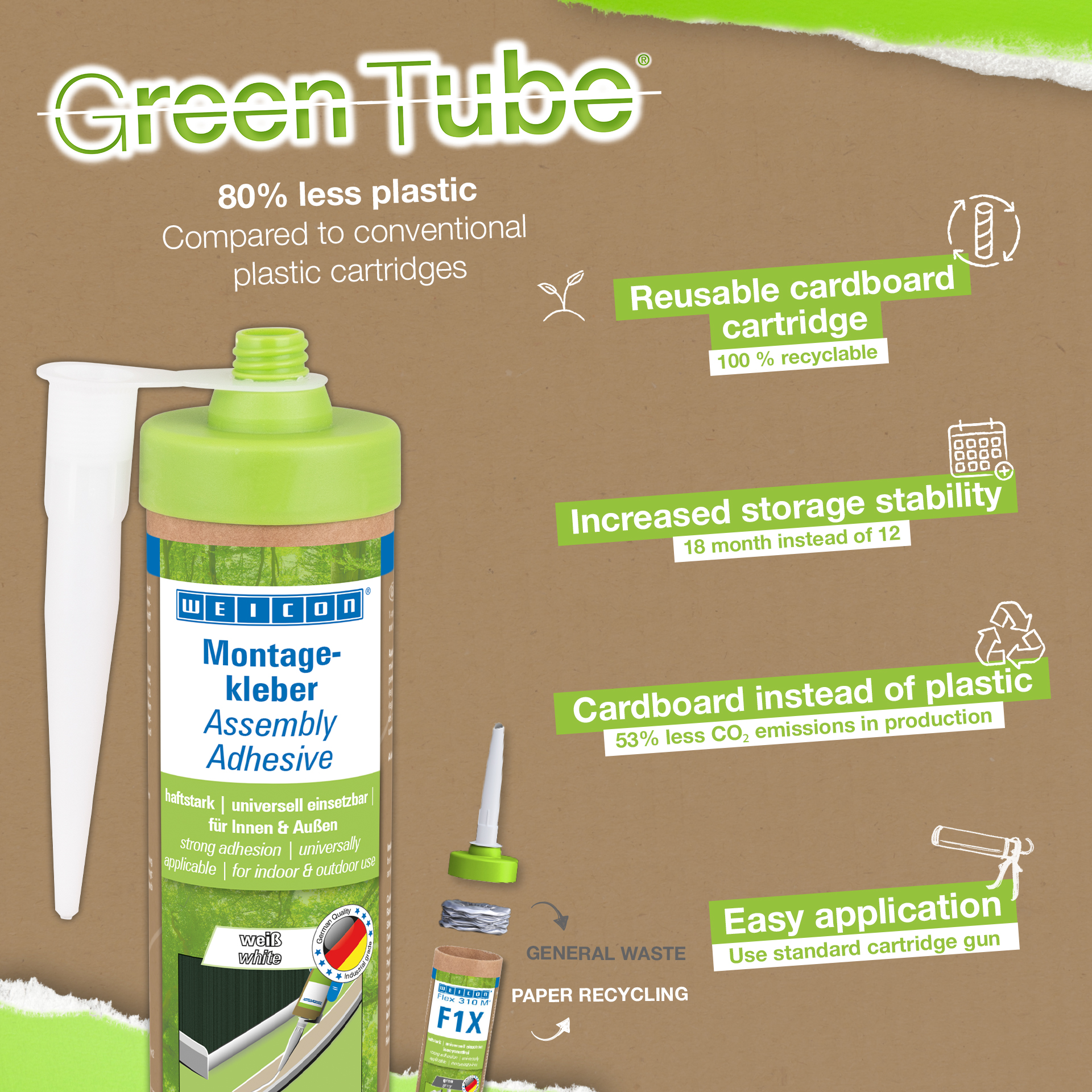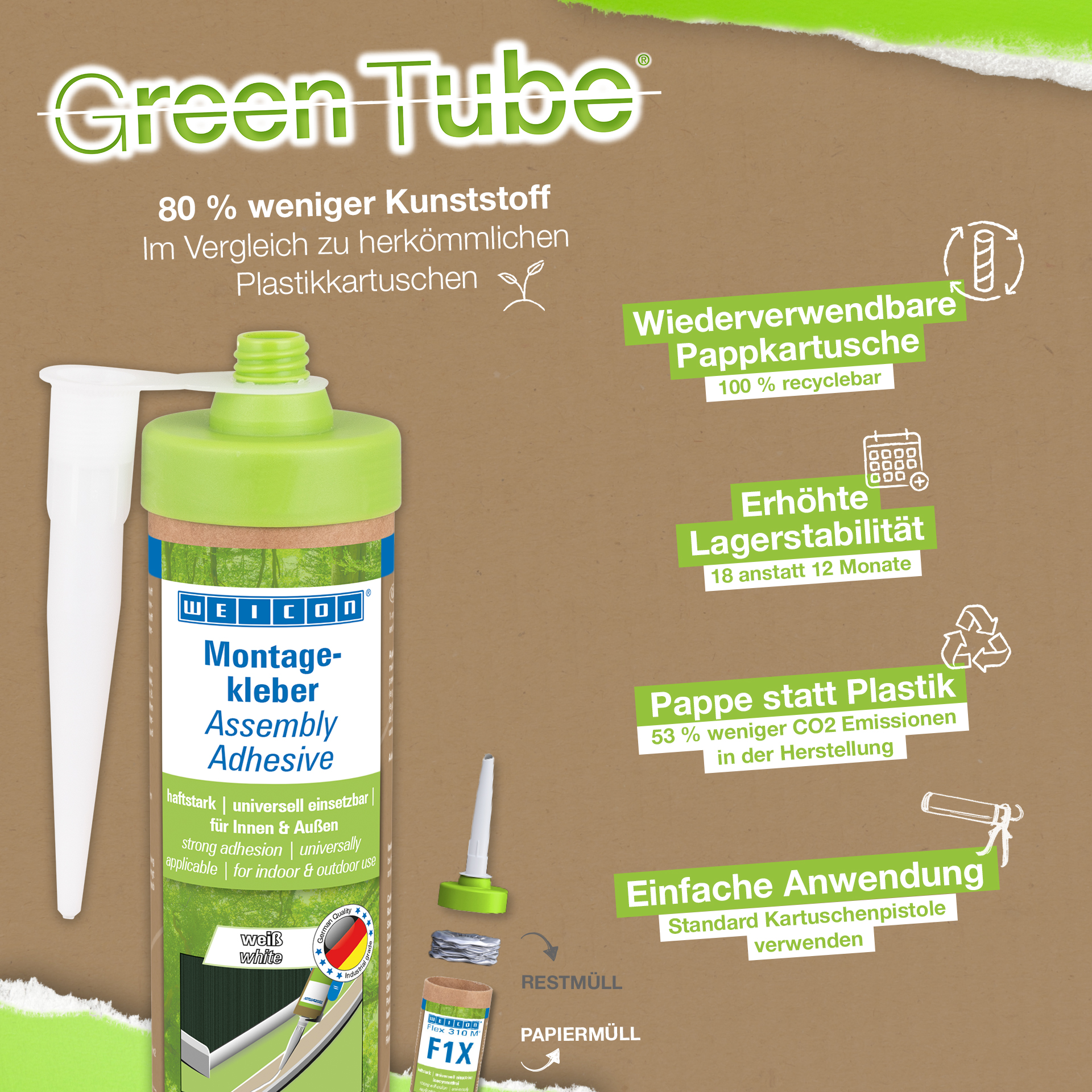 Montážní lepidlo WEICON je silné disperzní akrylátové lepidlo pro montáž, opravy a retušování. Lepidlo má vysokou počáteční přilnavost a konečnou pevnost a rychle vytvrzuje. Po zaschnutí lze montážní lepidlo přebrousit, omítnout a natřít běžně dostupnými barvami a laky. Lepidlo je odolné vůči teplotám v rozmezí od -20 °C do +80 °C a je vhodné pro vnitřní i venkovní použití. Bílé flexibilní lepidlo je nízkoemisní a neobsahuje rozpouštědla. Montážní lepidlo je univerzálně použitelné a lze jej použít pro širokou škálu aplikací. Je ideální například pro povrchové lepení materiálů na bázi dřeva (jako jsou soklové lišty, ozdobné lišty, panely nebo dřevotřískové desky), PVC, polystyrenu, desek z pěnového polystyrenu, tuhé PU pěny (např. izolačních desek a kabelových kanálů), minerálních materiálů (např. dlaždic) a kovů na savé podklady, jako jsou omítky, beton, vláknocement, sádrokarton a neošetřené dřevo. Ekologický obal - stále stejný vysoký výkon! Green Tube, udržitelný obal: špička a víčko jsou vyrobeny ze 100% recyklovaného plastu a pouzdro kartuše je vyrobeno zcela z kartonu. To znamená nižší emise CO₂ a menší spotřebu plastů ve srovnání s běžnými kartušemi - a to vše bez omezení výkonu!
