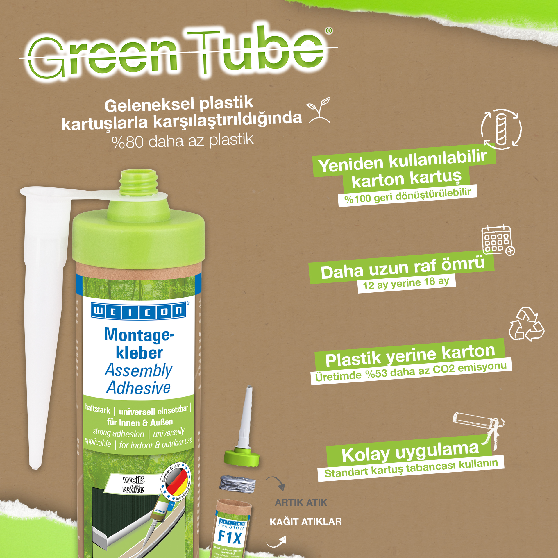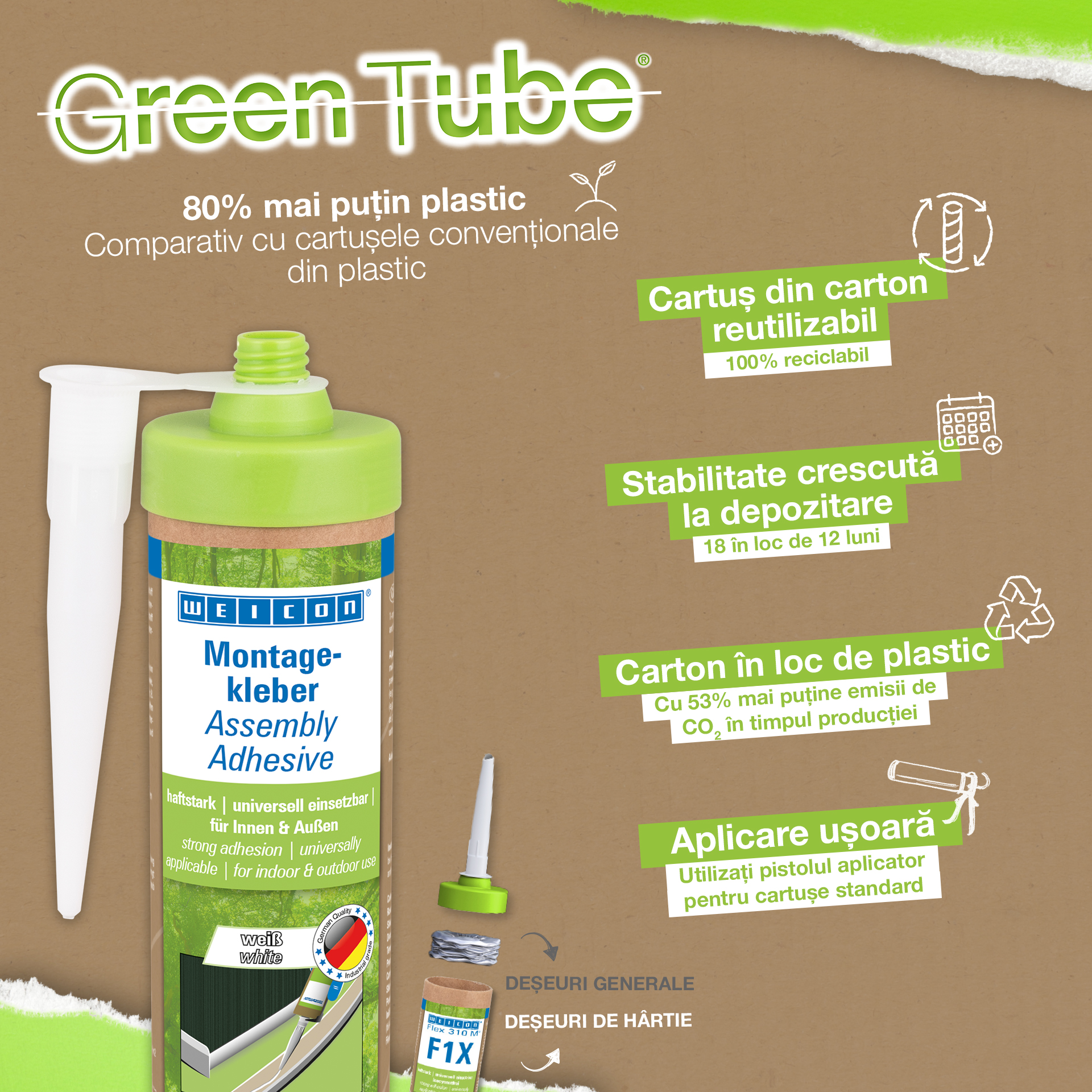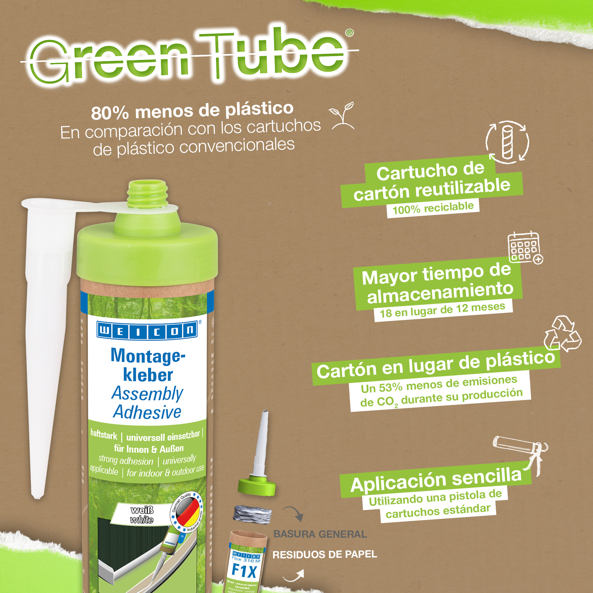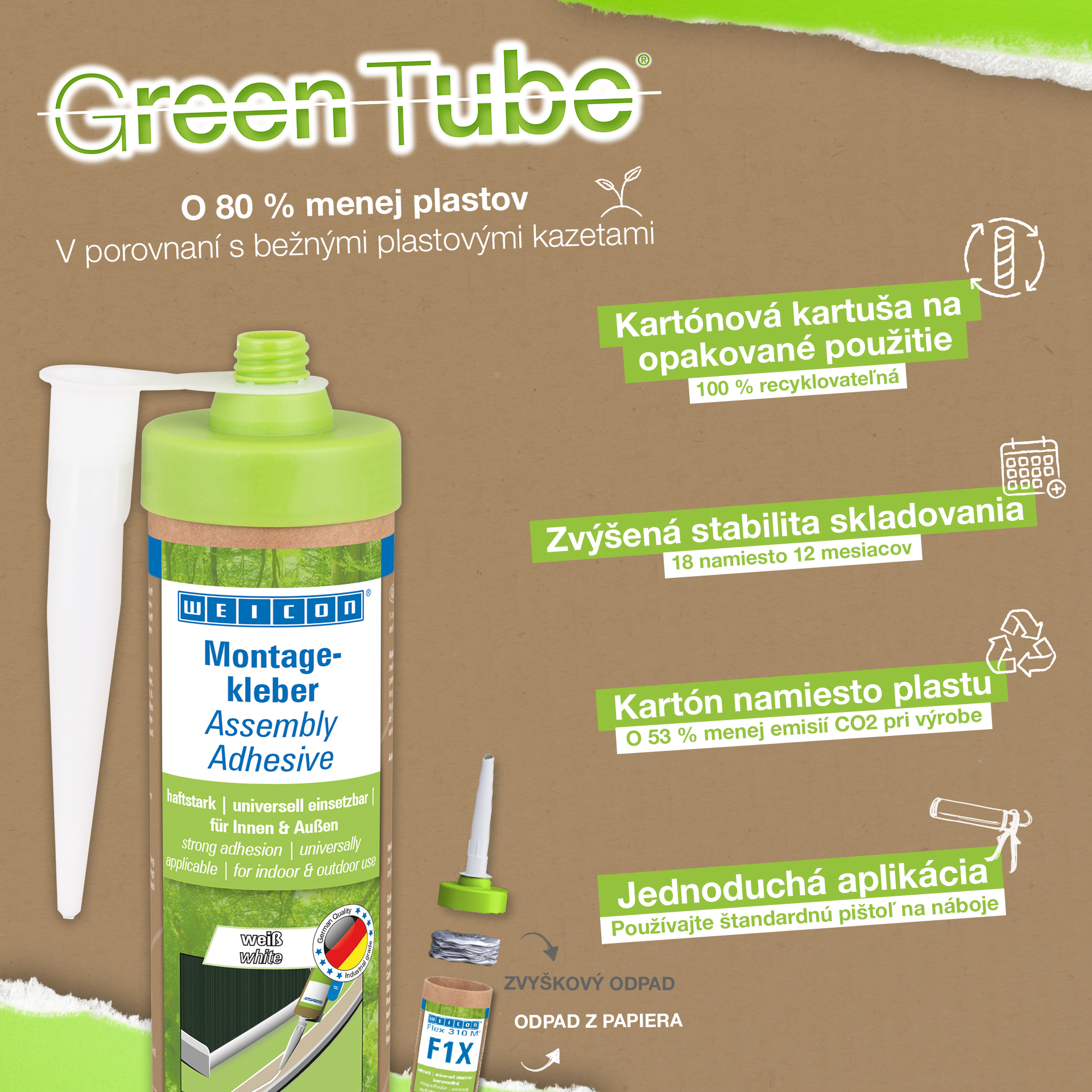 Montážní lepidlo WEICON je silné disperzní akrylátové lepidlo pro montáž, opravy a retušování. Lepidlo má vysokou počáteční přilnavost a konečnou pevnost a rychle vytvrzuje. Po zaschnutí lze montážní lepidlo přebrousit, omítnout a natřít běžně dostupnými barvami a laky. Lepidlo je odolné vůči teplotám v rozmezí od -20 °C do +80 °C a je vhodné pro vnitřní i venkovní použití. Bílé flexibilní lepidlo je nízkoemisní a neobsahuje rozpouštědla. Montážní lepidlo je univerzálně použitelné a lze jej použít pro širokou škálu aplikací. Je ideální například pro povrchové lepení materiálů na bázi dřeva (jako jsou soklové lišty, ozdobné lišty, panely nebo dřevotřískové desky), PVC, polystyrenu, desek z pěnového polystyrenu, tuhé PU pěny (např. izolačních desek a kabelových kanálů), minerálních materiálů (např. dlaždic) a kovů na savé podklady, jako jsou omítky, beton, vláknocement, sádrokarton a neošetřené dřevo. Ekologický obal - stále stejný vysoký výkon! Green Tube, udržitelný obal: špička a víčko jsou vyrobeny ze 100% recyklovaného plastu a pouzdro kartuše je vyrobeno zcela z kartonu. To znamená nižší emise CO₂ a menší spotřebu plastů ve srovnání s běžnými kartušemi - a to vše bez omezení výkonu!